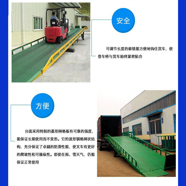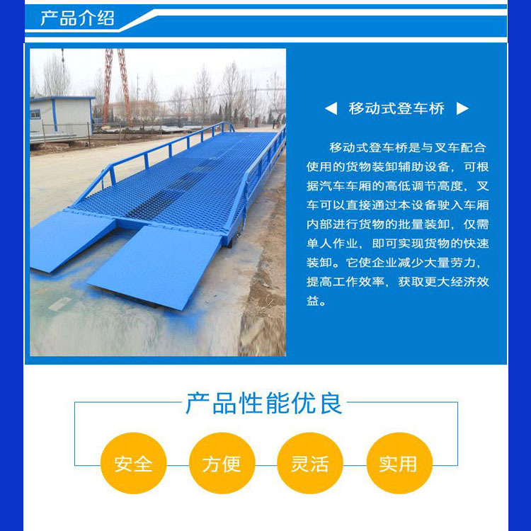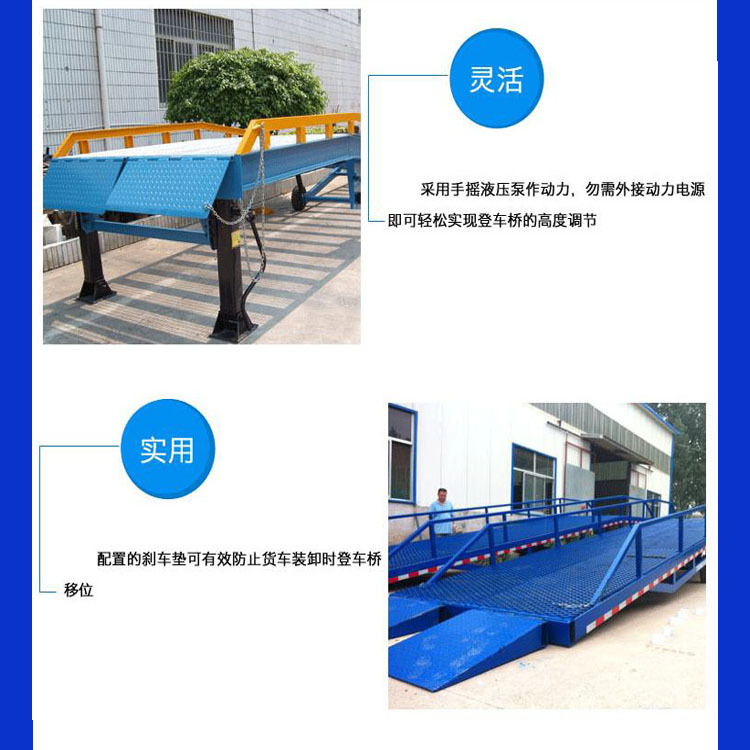 移動(dòng)式登車(chē)橋應(yīng)用于無(wú)裝卸站臺(tái)或裝卸位置不固定以及裝卸場(chǎng)地狹小等場(chǎng)合,實(shí)現(xiàn)了貨物快速裝卸。通過(guò)它使叉車(chē)等搬運(yùn)車(chē)輛直接進(jìn)入貨車(chē)、集裝箱、列車(chē)車(chē)廂裝卸貨物,大大的提高了工效。登車(chē)橋采用手動(dòng)液壓操縱,無(wú)需其它動(dòng)力,能適用于各種裝卸場(chǎng)合;登車(chē)橋采用支腿支撐和網(wǎng)格狀鋼板結(jié)構(gòu),有更可靠的安全性能。