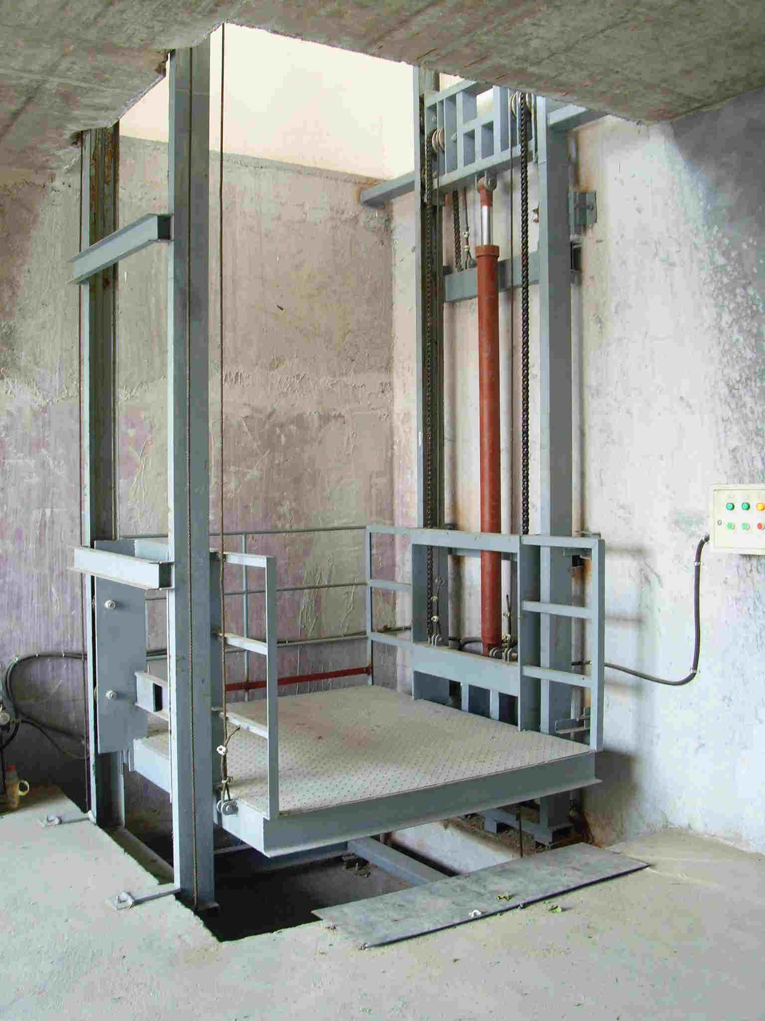 升降機采用液壓油缸作為主要動力,通過重型鏈條和鋼絲繩傳動,保證機器運行的絕對安全。無需地坑和機房,特別適合于有地下室、倉庫改造、新建貨架等,具有安裝維修方便、美觀、安全、操作方便。具體根據(jù)現(xiàn)場的實際環(huán)境生產(chǎn)。